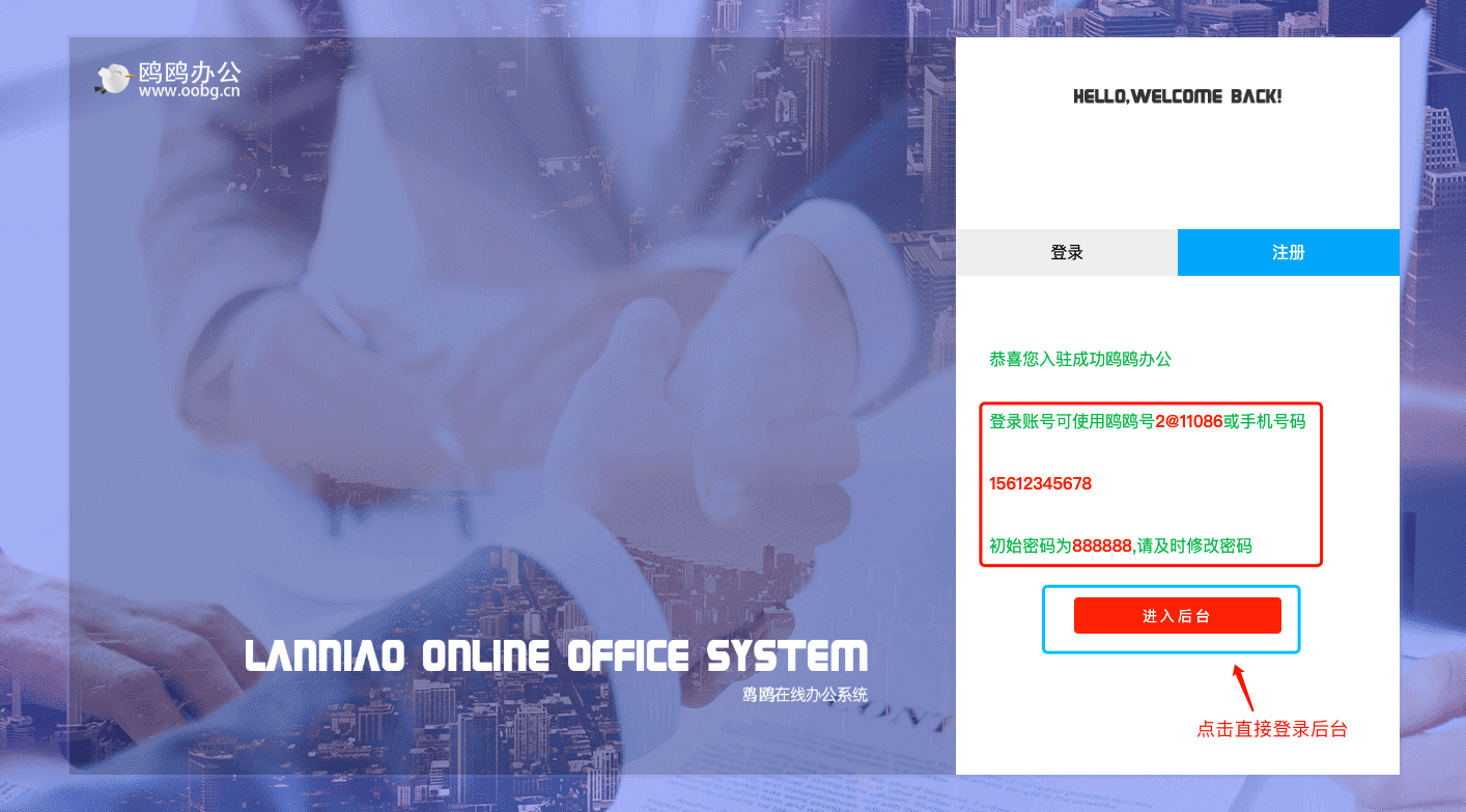 进入注册页面,填入企业名称、部门名称、姓名、手机号即可注册成功,注册后,即会出现账号密码(企业首个注册人,即是企业创始人,有管理员权限),点击“进入后台”,即可进入用户中心。